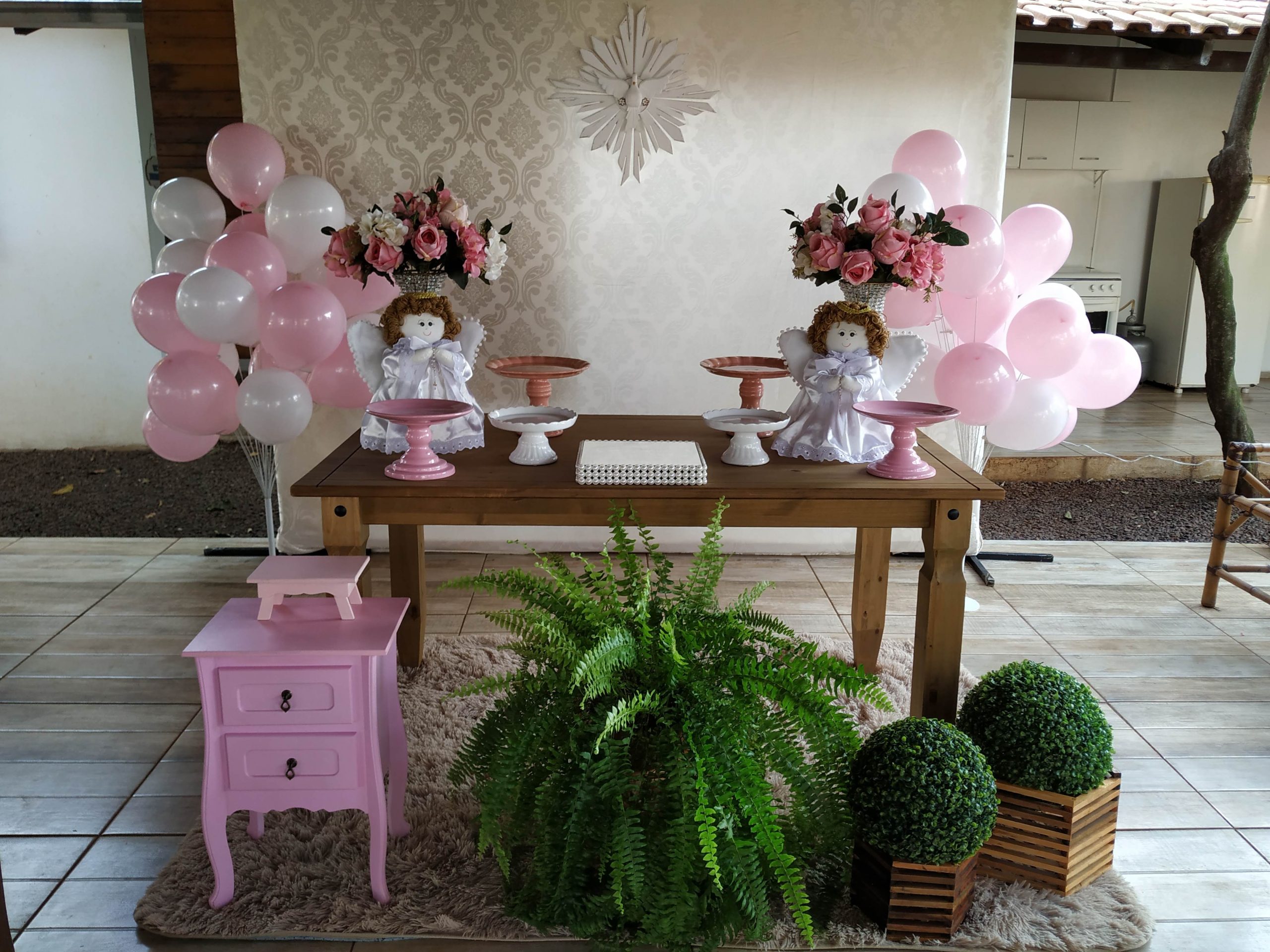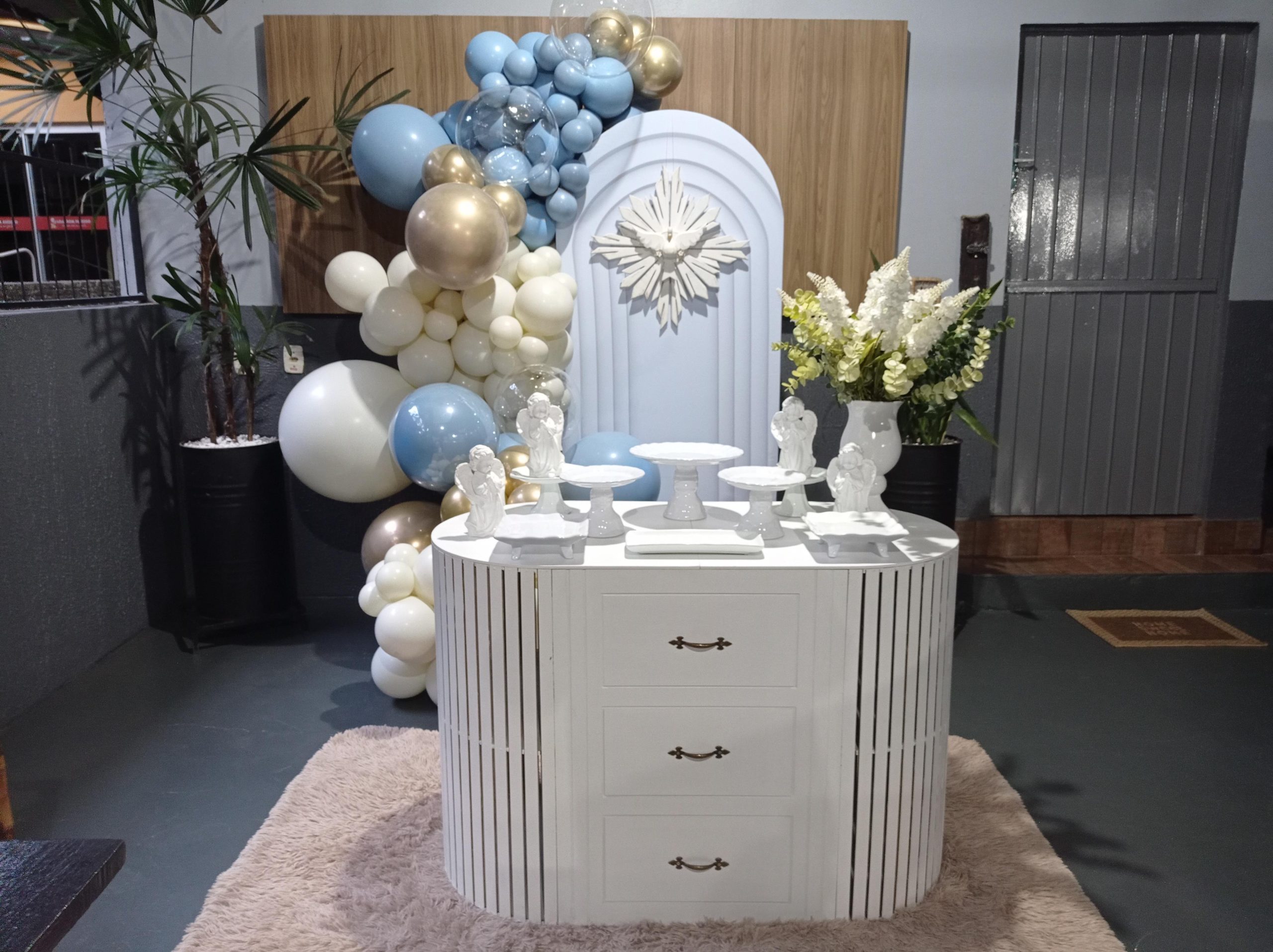 Utilizamos uma seleção de peças decorativas, como arranjos de flores, e muitos outros elementos que deixam o evento ainda mais bonito e cheio de significado. Além disso, balões delicados, painéis temáticos e detalhes dourados ou prateados podem ser incluídos para dar um toque de sofisticação à decoração.