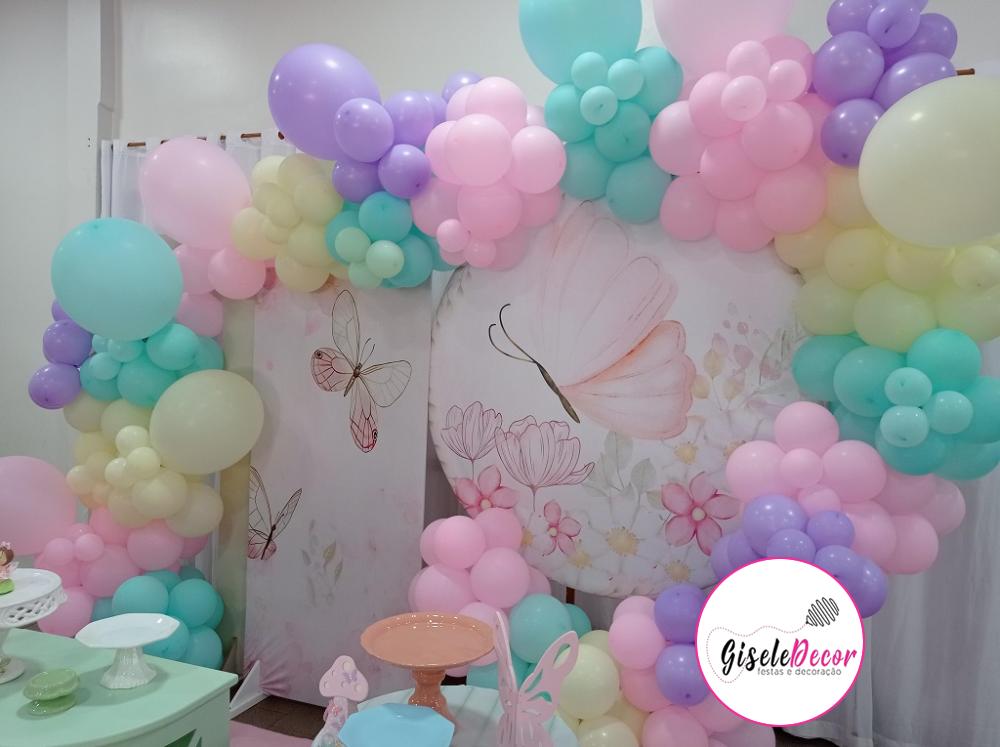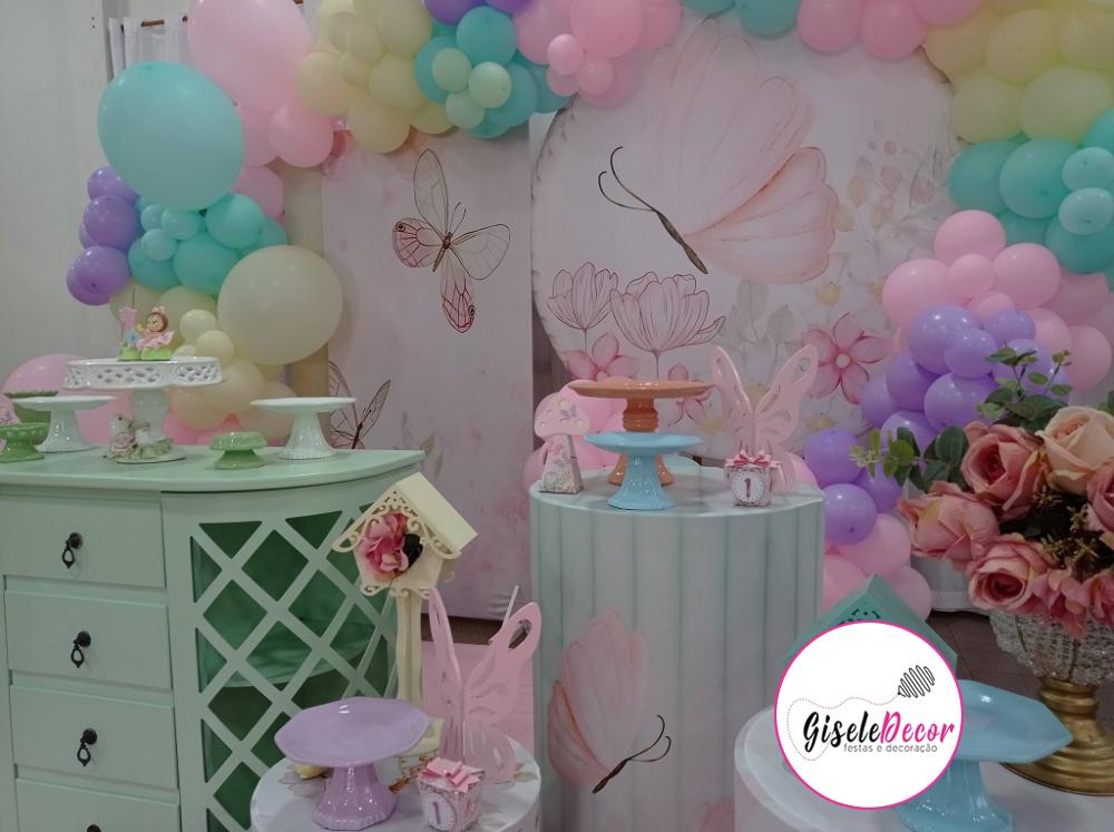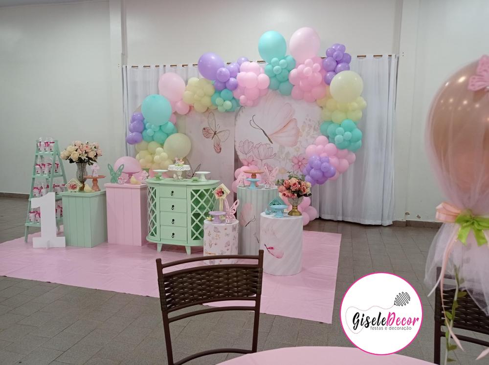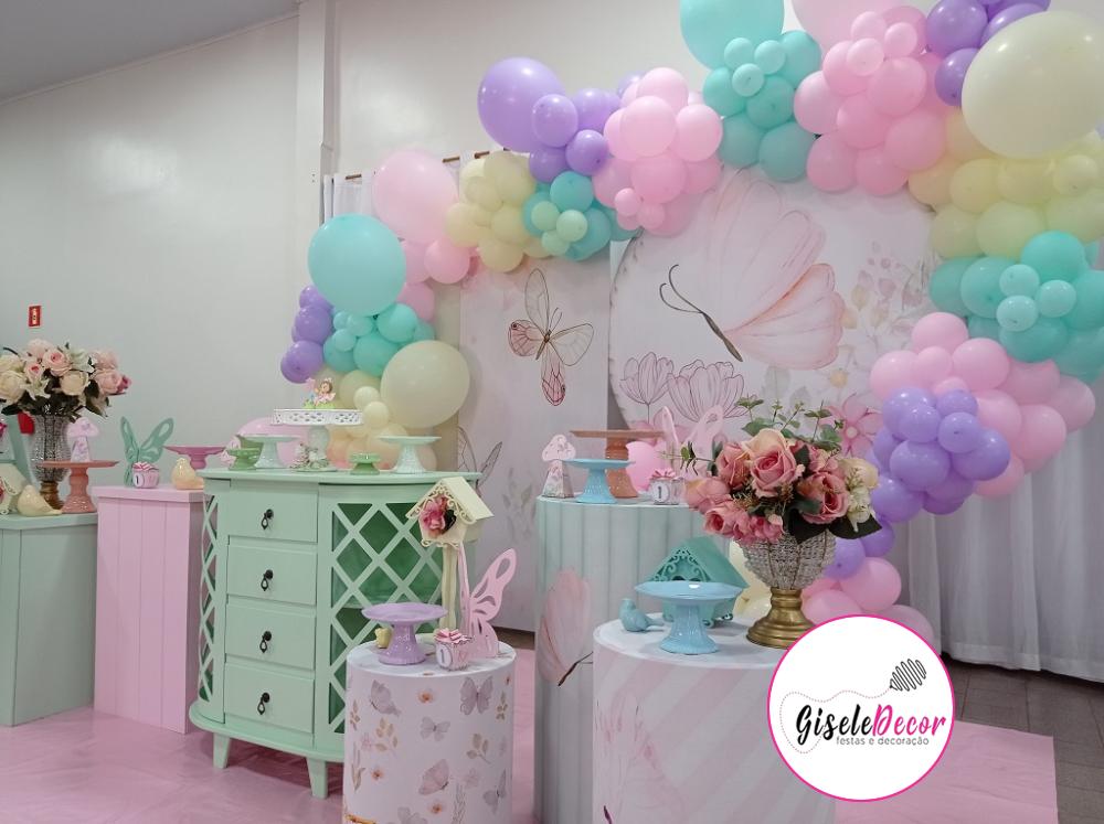 Decoração de festa infantil tema jardim das borboletas realizado na ASSERMUTO (Associação dos Servidores Municipais de Toledo) em Toledo – PR.